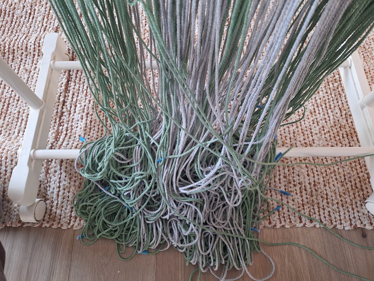 Sen jälkeen jokaiseen langanpäähän ( 96 x 2) käärin palan maalarinteippiä, ettei langan päät ala purkaantumaan jo alkumetreillä. Mopparilanka, jota käytän työhöni, lähtee helposti purkaantumaan kierteiltään. Siksi tämä työläs työvaihe tuleee tehtyä.