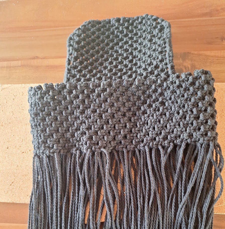 Aloitin repun teon "läpästä". Sen jälkeen lisäsin lankoja niin, että voin jatkaa solmujen tekoa ympyränä. Näin sain repun sellaiseksi, että sivusaumoja ei tarvinnut olla. Ihan kätevää ja nopeasti valmista. Tätä jatkuu niin kauan, kunnes repun korkeus on sopiva.