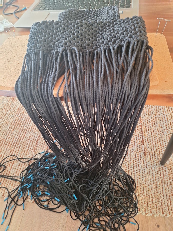 Hurjasti tuli taas pätkittyä lankoja. Varmaan kilon verran lankaa työhön menee. Musta lanka on hieman haastavaa solmia, kun solmuja ei oikein kunnolla näe. Reppuna väri näyttää kuitenkin mukavalta